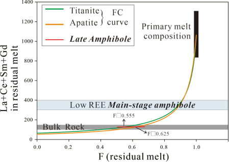 角闪石的稀土组成表明,岩浆在深部(~5km)经历分离结晶,刚到浅部就位时,稀土含量上升(图2)。但岩体就位后,岩浆中的稀土含量不断下降(图2)。模拟计算表明,岩浆中稀土含量的变化不能用副矿物(磷灰石、榍石等)的结晶来解释(图3),只能用流体出溶时迁移稀土元素来解释。