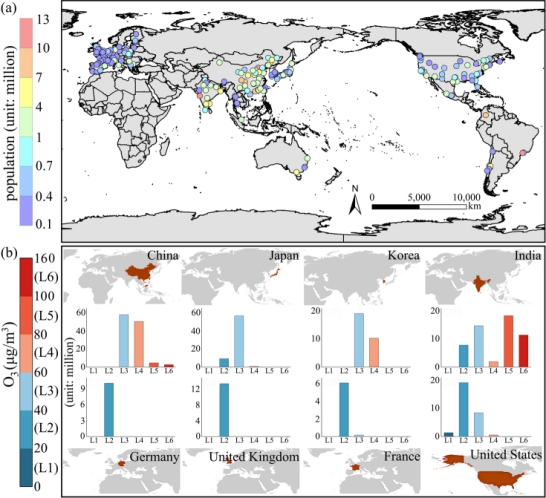 图1 全球261个城市人口分布和主要国家受不同程度臭氧污染影响人数
