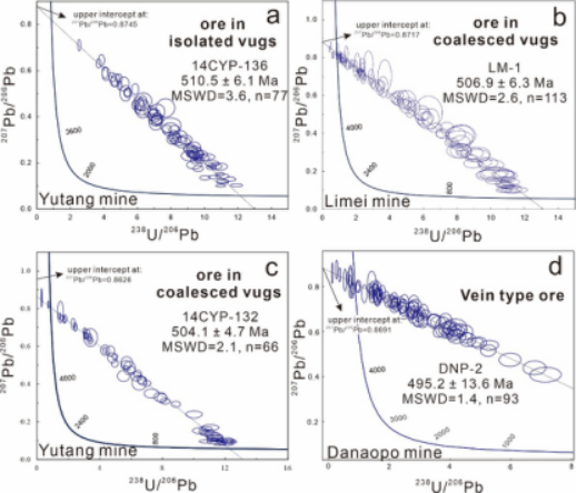 从早到晚,三期矿石年龄分别为510.5±6.1 Ma(图3a),506.9±6.3—504.1±4.7Ma(图3b-c)和495.2±13.6 Ma(图3d)。上述成矿年龄与前人提出的加里东陆内造山(~460-420 Ma)成矿(MVT矿床)明显不同;同时还指示了花垣矿区成矿作用从围岩沉积后不久即开始启动(准同生-早成岩期成矿),并持续到了围岩固结后若干个百万年(后生成矿)。流体包裹体等研究结果表明,矿区在成矿时具有高地温梯度异常。