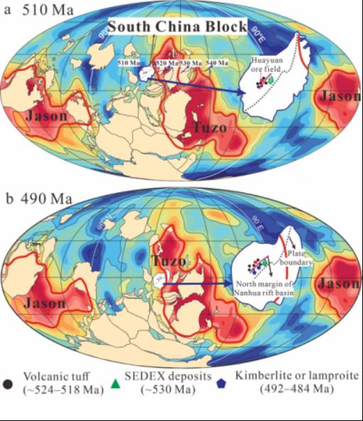 扬子与华夏板块碰撞形成江南造山带(~980-820 Ma)后不久便发生区域伸展形成南华裂谷盆地,并于~760 Ma停止活动。加里东陆内造山约发生于~460-420 Ma,而760-460 Ma期间,区域内未发现大规模的构造和岩浆活动。但古地理重建显示,寒武纪时华南板块位于地幔底部大型横波低速异常区LLSVP(Tuzo)边缘(图5),这可能会导致深部地幔物质和热量的上涌。事实上,寒武纪时,在冈瓦纳大陆的东北缘发育有澳大利亚北部的玄武质Kalkarindji大火成岩省(~511Ma)和位于华南和澳大利亚陆块之间的酸性Pinghe大火成岩省(Dan et al., 2023)。深部地幔活动对陆内的南华盆地区域也有影响,例如南华盆地边缘镇远地区即发育有马坪金伯利岩(492±12Ma)和溪头煌斑岩等(484±8Ma)等幔源岩浆岩(Zhang et al., 2023),牛蹄塘组中发育有524.2-518 Ma的火山灰(Zhou et al., 2008; Wang et al., 2012; Chen et al., 2014),盆地内有~530 Ma的SEDEX型Pb-Zn矿(Zhou et al., 2018, 2022)等。