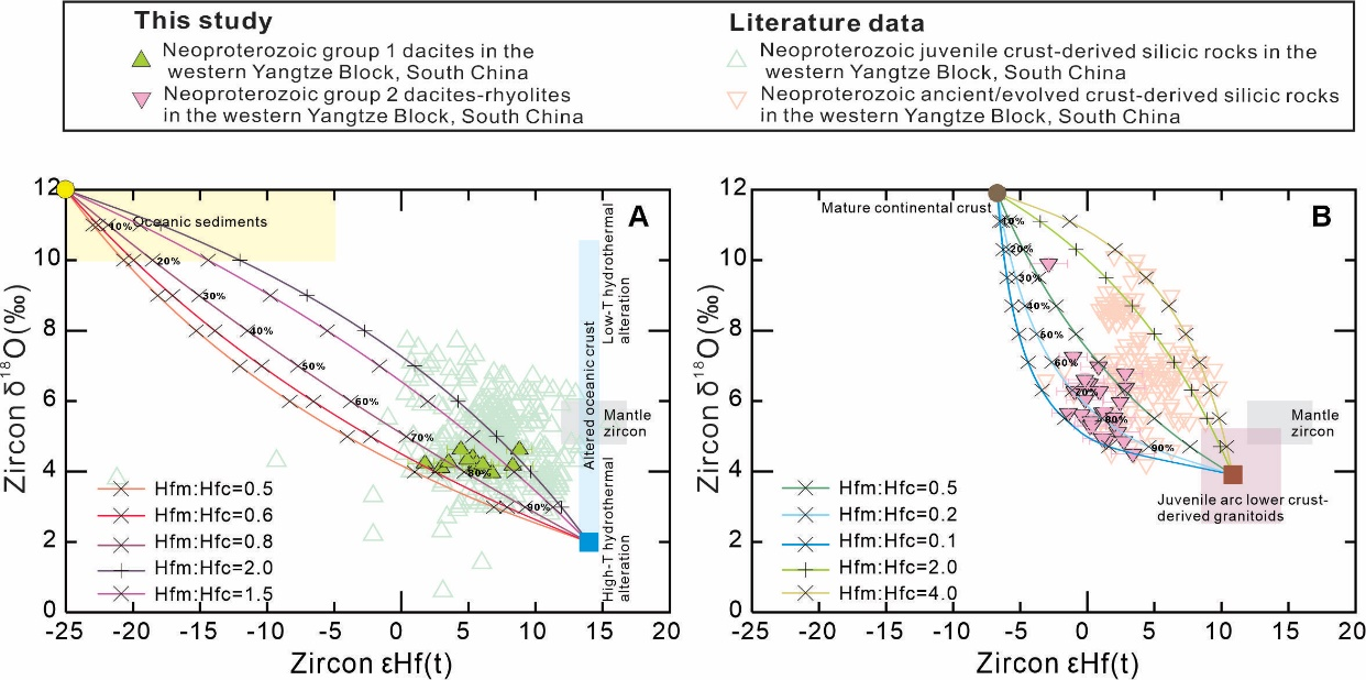 结合扬子西缘新元古代俯冲构造背景,研究团队提出受俯冲板片熔体(低δ18O)交代的地幔岩浆上涌形成新生弧下地壳,进一步熔融产生低δ18O硅质岩浆,交代地幔/新生地壳来源的热量加热上覆成熟地壳发生部分熔融,形成高δ18O的硅质岩浆(图5)。