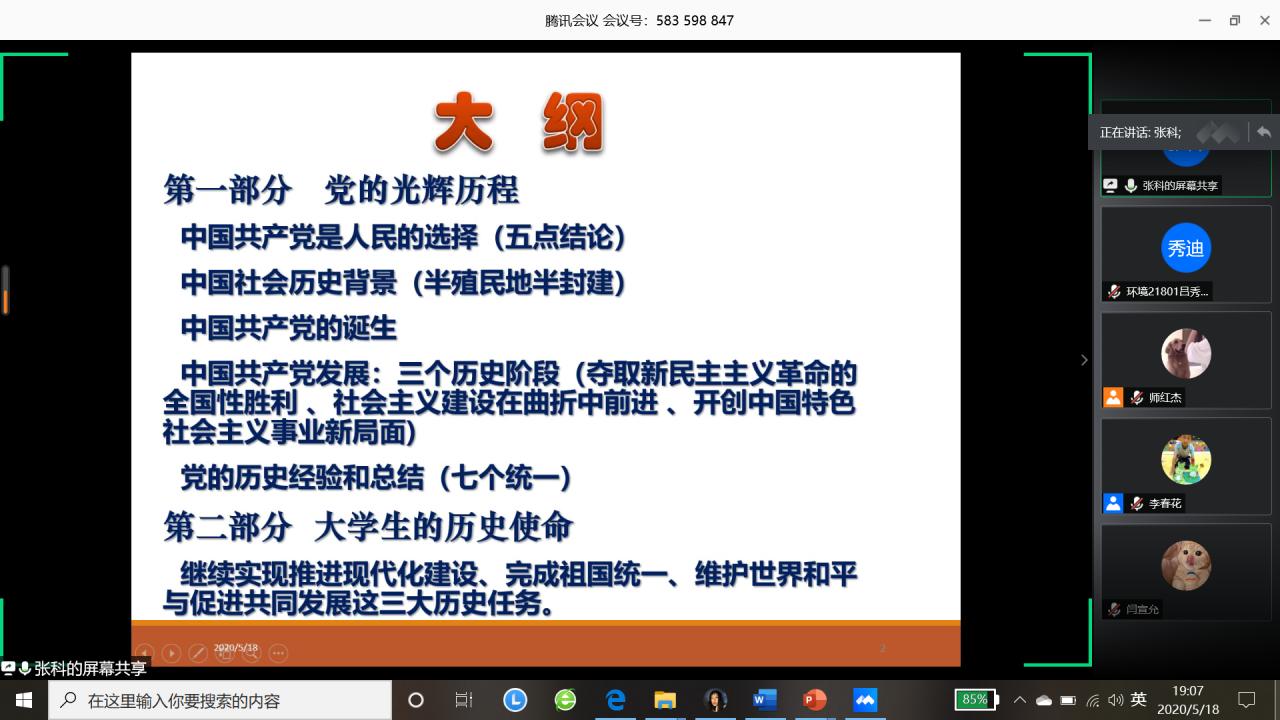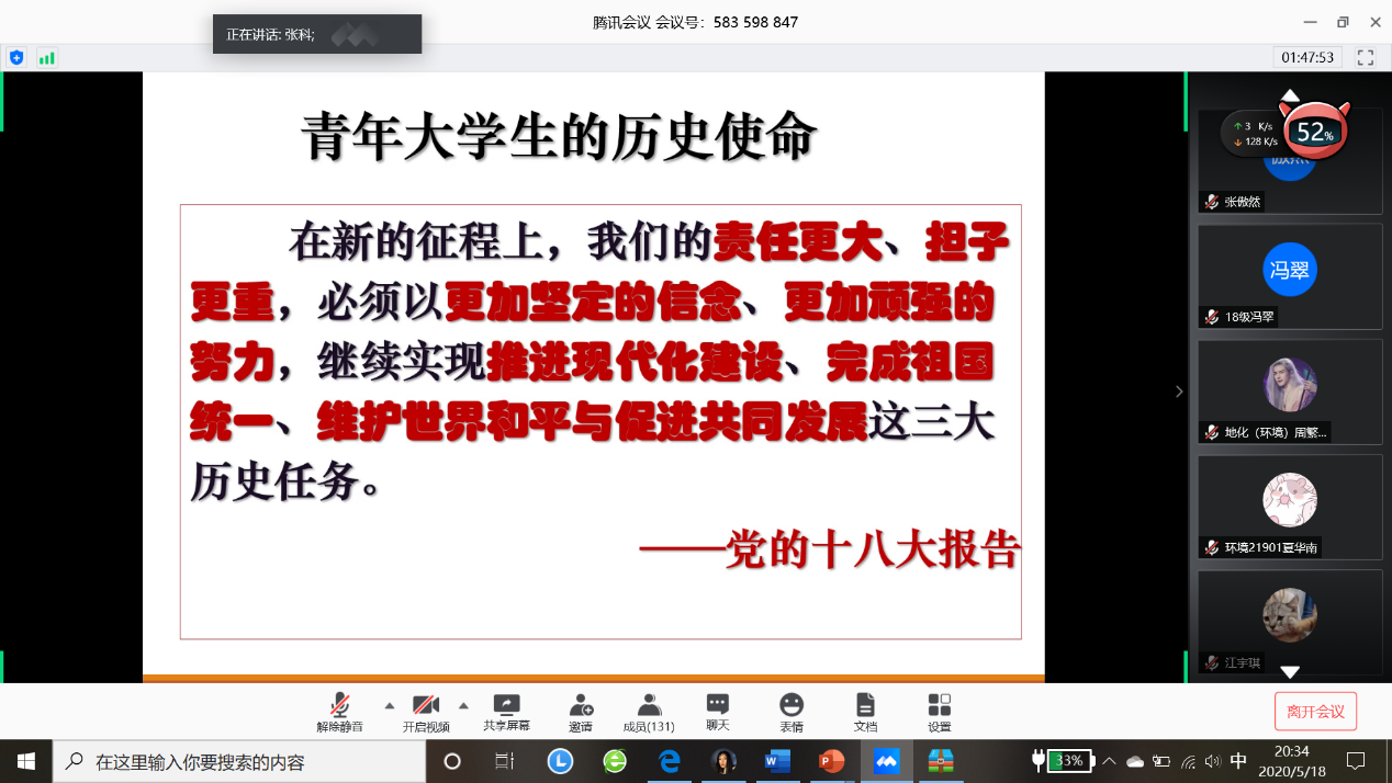 (图/文:吕秀迪)为进一步做好资源与环境公司党员发展工作,加强对发展对象和入党积极分子的教育和培养,引导其提高思想觉悟,保证发展新党员的质量。bw西汉姆联于2020年5月18日晚19:00以线上腾讯会议的形式举行了2020年上半年入党积极分子和党员发展对象培训会议。公司党委书记张科主讲,党委副书记范梅英参加、本科员工工作党支部书记李春花主持,共130余名入党积极分子和党员发展对象线上学习。