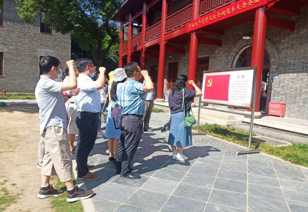 “我志愿加入中国共产党......随时准备为党和人民的事业牺牲一切,永不叛党。宣誓人.....”在中共五大会议的旧址前,全体党员面向党旗,右手握拳,庄严宣誓,重温入党誓词,回忆革命先辈们走过的光辉历程。