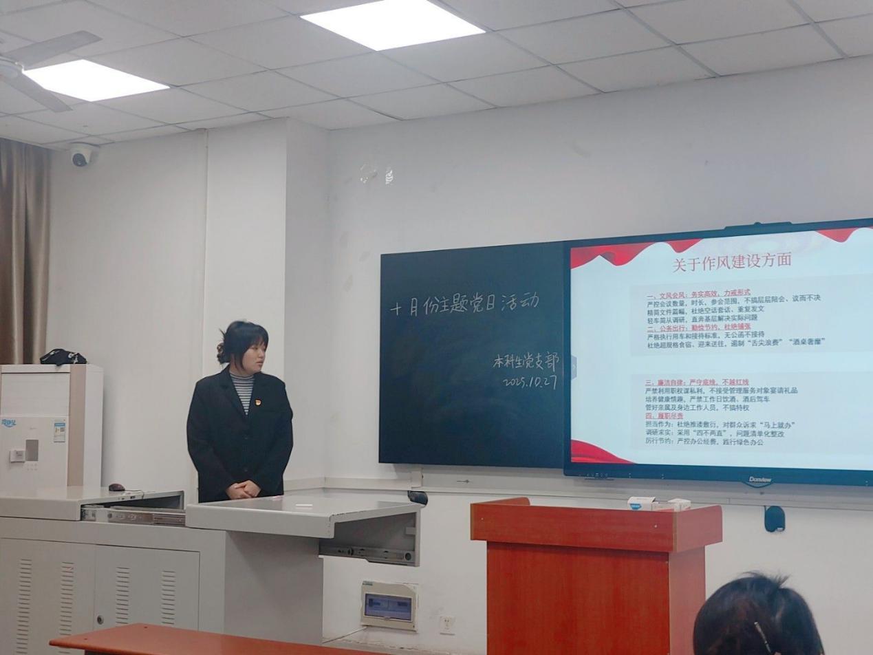 (通讯员 谭润格)2025年10月27日下午6:00,本科生党支部于武教A101召开“争朝夕昂扬奋进,搏浪潮锦绣新篇”十月支部主题党日活动。本次活动由黄宇同志主持,党支部书记刘娥老师及全体员工党员参加。 会议伊始,黄宇同志带领全体党员进行总纲学习,深入剖析党的章程。随后由黄若曦同志以“走读红色沃土,砥砺奋进初心”为主题开展微党课学习,呼吁广大同志在面对苦难挫折时要坚定理想信念。接下来,由王艺燃同志讲授微党课,聚焦中央八项规定精神,分析典型案例,进一步强化全体党员的纪律意识。同学们就“如何立足岗位,服务中国式现代化建设”主题展开交流研讨。党员同志们从理论和实际两方面深入探索,表示不仅要提升专业能力,更要培养创新精神,将个人理想与国家未来紧密结合,听党话,跟党走。 活动结束后,刘娥书记总结发言。她对本次活动的组织成效给予肯定,同时要求全体员工党员,要持续深入学习党的理论,扎实做好党建联系人工作,并坚持知行合一,将热情转化为脚踏实地、真抓实干的具体行动,展现党员担当。(审核 李春花)