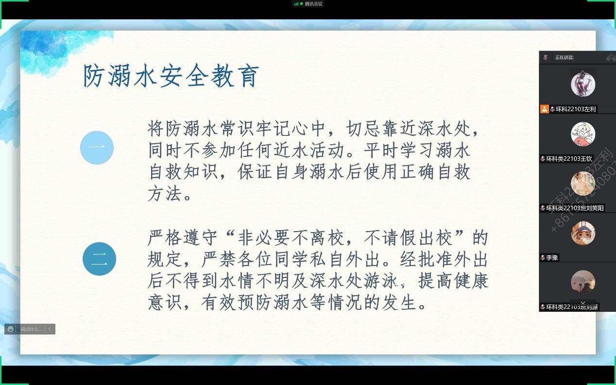 首先,由各班安全委员为同学们详细讲解PPT上相关内容,如何去避免溺水情况的发生、溺水时如何自救、遇到他人溺水应当如何在保护自身安全基础上去帮助他人,同时强调了在疫情期间公司的防疫相关规定,留校员工要严格遵守“非必要不离校,不请假不离校。” 坚持完成每日健康打卡、晚点名和核酸检测等,在此基础上安全委员播放了安全教育视频,让同学们理解更加透彻。
