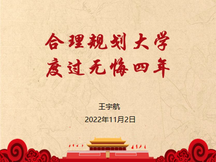 王宇航同学从介绍公司旁边的炒粉店创业经历说起,通过讲述老板不惧失败,多次创业的故事,针对当前部分同学在封控期间沉迷游戏,作息不规律的现象,他鼓励22级新生把握好大学中的青春时光,敢于尝试,不怕困难。