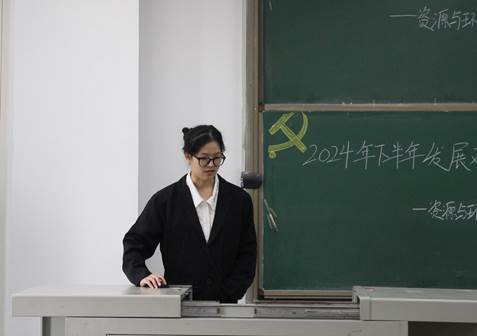 八位候选人依次上台答辩,分别从自我介绍、入党动机、对党的认识、自身不足与改进办法、未来规划等方面阐述。以谈星星同学为代表讲述了她自身经历,在家乡红色文化的熏陶下,崇尚党,敬畏党,渴望加入党组织,表明自己愿意为党事业奋斗的决心。她提到在担任班导期间,陪伴大一同学早晚自习,认真落实他们的英语学习,所带的班级四级通过率达到93%,同时她也密切关注同学们的日常生活,为同学们答疑解惑,她认为班导的经历既充实自己的老员工活也给她带来满满的成就感。