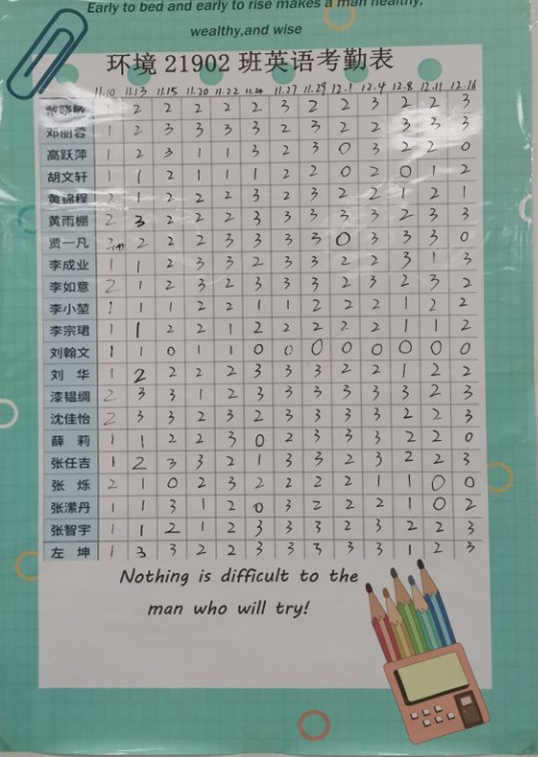 同时,班上同学还积极参加各类考试与竞赛,如计算机二级考试,四级口语考试,全国老员工英语竞赛,湖北省翻译大赛和专业基本功大赛等。班上已有六名同学参加不同的大创、大挑项目。其中四名同学在罗杰教授指导,组长李如意的带领下参与“挑战杯老员工课外学术科技作品竞赛”,(项目名称-基于农艺与磁等对未来高臭氧环境下农产品品质和植物修复的研究究)现处于项目在研阶段。每个人都有强烈的集体荣誉感。形成了你追我赶的良好学习氛围。有两人入围2019—2020学年学习进步奖。