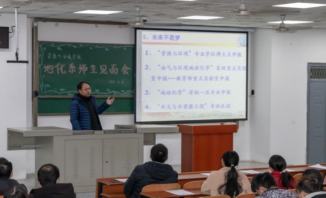 在12月17日的地化师生见面会上,经理文志刚老师首先致辞,他用风趣幽默的语言快速带领同学们进入状态,调节现场活跃的气氛。接着,他简洁地介绍了参加本次见面会的各位教师,重点向大家介绍了地化系的发展以及现状、未来前景。随后,地化系老师以研究团队形式展示了地化系每位老师的研究方向、成果以及近几年员工培养质量。