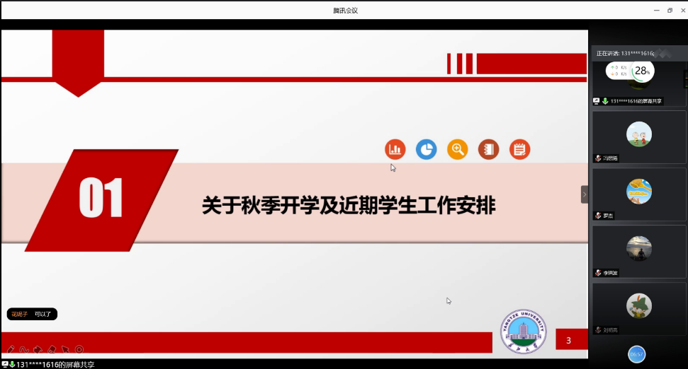 (通讯员 刘思雨/图 李婉婷/文)全国上下万众一心,共同抗击疫情数月后,各地疫情基本已经得到控制,我们也终于看到了胜利的曙光。8月21日下午3点,bw西汉姆联官网平台bw西汉姆联于线上腾讯会议进行了一场班主任会,本次会议主要是关于秋季开学及近期员工的工作安排。本次会议由范梅英书记主持,所有班主任老师出席本次会议。本次会议的目的主要是讲述如何利用开学前的这一段时间,严防死守、群控群防,确保各项防控措施得到落实,扎实做好春季开学各项疫情防控准备工作。