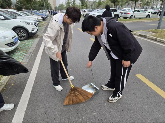 师生手持清扫工具,神情专注,斗志满满,于东校区小西门前广场集中开展清扫任务。活动中,大家你捡我扫,分工明确,默契配合,无论是校园主干道,还是室外停车场,都呈现出一片繁忙的景象。同学们挥舞着扫帚清理地面的灰尘与落叶,用垃圾拾物器细致地捡拾花坛间的烟头、纸屑等杂物,金黄落叶虽美,也成为清扫的重点对象。师生们干劲十足,对校园主干道、室外停车场、花坛边等地段进行地毯式清理。在大家的努力下,校园很快恢复了整洁与美丽,宛如一条金色丝带串联起了整个校园的活力与风光。