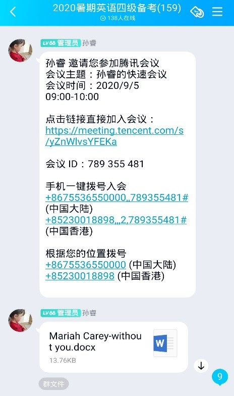 线上英语教师交流会,暑假期间邀请了外语公司优秀教师孙睿老师给同学们线上指导;形成辅导员、班主任、班级导师、英语教师和家长五位一体的的联动模式,以确保同学们的英语学习不流于形式,并希望以英语学习推动同学们自我学习、自我管理的学习生活习惯。