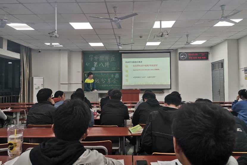 田润丰学长更侧重于向同学分享答题技巧。他介绍了四级考试的一些注意事项,如在听听力时,涂写答题卡需要边听边涂,作文需要在三十分钟内写完等。在交代考试注意事项事项后,为了使大家更好理解,采用互动的方式向在场各位展示了几个选词填空题答题,通过同学们参与回答及讲述做题感受,再来分析其中的技巧,使得现场的氛围活跃了起来,同时也大家更深刻直观地感受到了四级考试的难度以及需要做的准备。