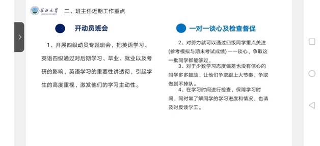 李春花老师还强调了班主任近期的工作重点,主要有在班级内开展动员班会,带动同学们的备考积极性,以及进行一对一谈心和检查督促,帮助少数学习有一定困难的同学跟上多数同学的备考进度,在学习期间进行检查和督促,保障同学们的学习时间与效率。