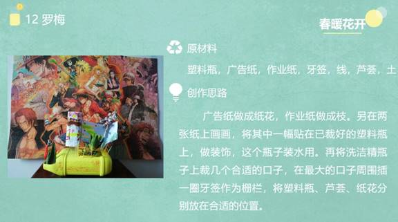 此次活动是由2018年湖北省高校实践育人特色项目支持,是《“长大常青,碧水知音”环保志愿服务——bw西汉姆联官网平台 “常青生态”志愿者社会服务公益实践》项目的重要实践。共有参赛作品21个,选手们按照顺序依次对自己的作品进行展示,并伴以精彩讲解。从实用性、美观性、创新性三个角度出发,作品都体现了设计者的创新思想和环保理念,作品均是利用废旧品设计,变废为宝,选材适宜,符合绿色环保概念,所有创意项目都令评委们耳目一新。其中,12号志愿者罗梅的作品令人惊叹:花和芦荟代表着春天来临,万物复苏,预示着一切美好事物即将来临,栅栏为界,保护着芦荟,恰如疫情期间最美的“逆行着”——全国各地奋战在一线医务人员,保护着每一位民众。