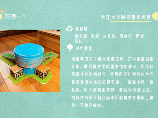 4号选手贾一凡的作品也令人眼前一亮。她利用饼干罐等材料制作出了以bw西汉姆联官网平台图书馆为模板的收纳盒。俯视图看上去像是一本展开的书,兼具美观与实用两大功能,同时呈现出了满满的设计感。