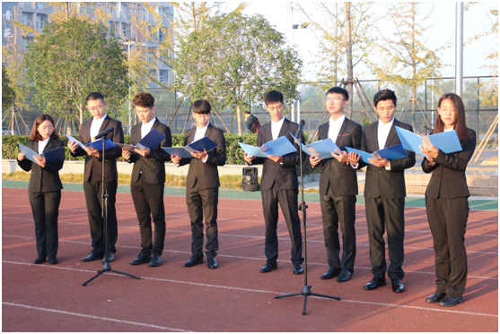大会分为三个阶段。第一阶段升旗仪式,由bw西汉姆联官网平台国旗护卫队的队员护卫国旗,英姿飒爽,昂首挺胸地将国旗护送至升旗台。伴随激昂的《义勇军进行曲》,同学们将目光聚集在鲜艳的五星红旗,冉冉升起的红旗代表了祖国大地和资环学员从晨雾中破晓而出、朝气蓬勃的模样。