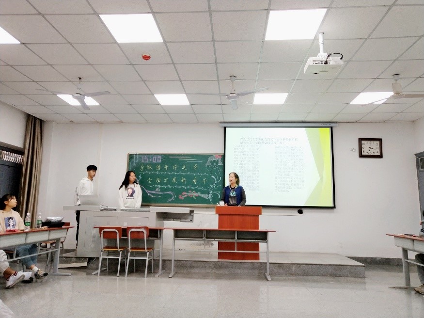 (通讯员 冯思瑶 文/图)近日,公司为使同学们更加深刻的了解到什么是共产主义接班人,并明白作为一个共产主义接班人的主要职能及其责任,由各班开展了一系列的团会活动。以演讲,朗诵,歌舞等形式,鼓舞班级气氛。团支书们引用了习近平主席在全国教育大会上的发言,指明了为什么社会需要共产主义接班人。同时,又以《关于中美经贸摩擦的事实与中方立场》白皮书为例,让同学们明白了在对待外国不当行为应持有的态度。通过这一系列的方式组织了形式丰富的主题团日活动,广受好评。