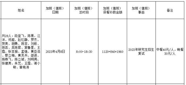 根据《bw西汉姆联官网平台加班(值班)误餐补助管理办法(试行)》(长大校发【2019】83号)文件规定,现对bw西汉姆联加班(值班)误餐情况(2023年4月8日)进行公示,如果对加班(值班)误餐情况有异议,可以通过电话或电子邮件等方式向bw西汉姆联办公室反映。