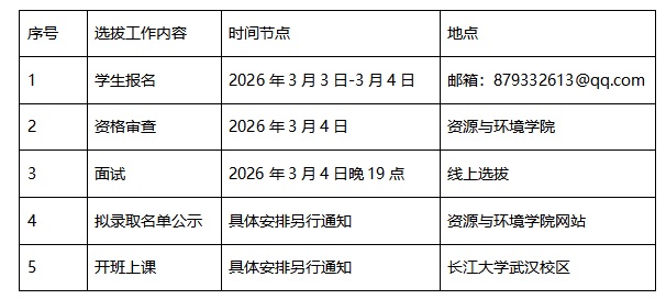 为深化拔尖创新人才培养模式改革,不断提高人才培养质量,更好地因材施教,促进优秀人才脱颖而出,现根据《bw西汉姆联官网平台拔尖创新人才培育试验计划实施办法(试行)》[长大校发(2012)156号)]和《bw西汉姆联官网平台普通本科生专业分流与转专业管理办法》[长大校发(2019)260号)],公司决定按照公平、公开、公正的原则,面向全校2025级本科生中遴选优秀员工,组建2025级地球化学专业“石油之光”实验班。现将有关事宜通知如下: 一、选拔范围及规模 2025级地球化学专业“石油之光”实验班从全校2025级员工中选拔产生,总人数为25人。 二、选拔条件 本次试点班员工从高考生源类型为理科的2025级本科生中选拔,申请报名员工需符合《bw西汉姆联官网平台普通本科生专业分流与转专业管理办法》规定,同时要求德智体美劳全面发展,品学兼优,身心健康,综合素质好;具有活跃思维、创新意识、强烈竞争意识和进取精神;具有较强的自主学习能力。 三、选拔程序 (一)自愿报名申请 申请参加实验班选拔的员工填写《bw西汉姆联官网平台2025级地球化学专业“石油之光”实验班员工申请表》(见附件1),员工将填写完整的申请表(附成绩单)于3月4日下午17:00时前(word电子版)发送到邮箱:879332613@qq.com。备注:申请表中申请人签名用电子签,资格审查部分由公司统一办理,申请员工无需办理。 (二)资格审核 1. 根据相关规定对申请员工进行资格审查; 2. 涉及转专业的,按照公司和教务处相关要求进行资格审查。 (三)考核方式 考核方式为面试。面试环节包括员工自述、评审小组提问。 (四)录取 1.综合成绩=一年级(第一学期)必修课成绩×60%+面试成绩×40%(分数按百分制计算) 2. 公司根据员工资格审核、综合成绩,确定2025级地球化学专业“石油之光”实验班拟录取员工名单并公示,公示无异议后报教务处批准并备案。 四、时间安排 联系人及电话:吴陈君 17762426368 孟 强 18164270228 陈 果 13511030600 bw西汉姆联官网平台 bw西汉姆联 2026年3月3日